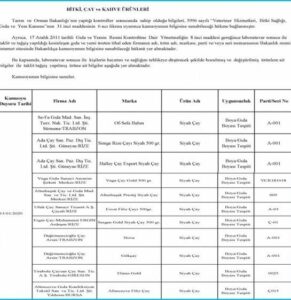 Çayı murdar eden bu firmalar keyfimizi bozmakla kalmadı, sağlımızı da bozdu. Çünkü çaya kimyasal boya katarak milleti büyük bir riske attı. Bu firmalar isim isim bakanlık tarafından açıklandı… Aralarında sektörün önemli isimleri bulunuyor. Tarım ve Orman Bakanlığı 2020 yılına ait ilk tağşiş listesini yayınladı. Yayımlanan listeye bakıldığında Çay ve Kahveye boya katan firmalar olduğu görülüyor.