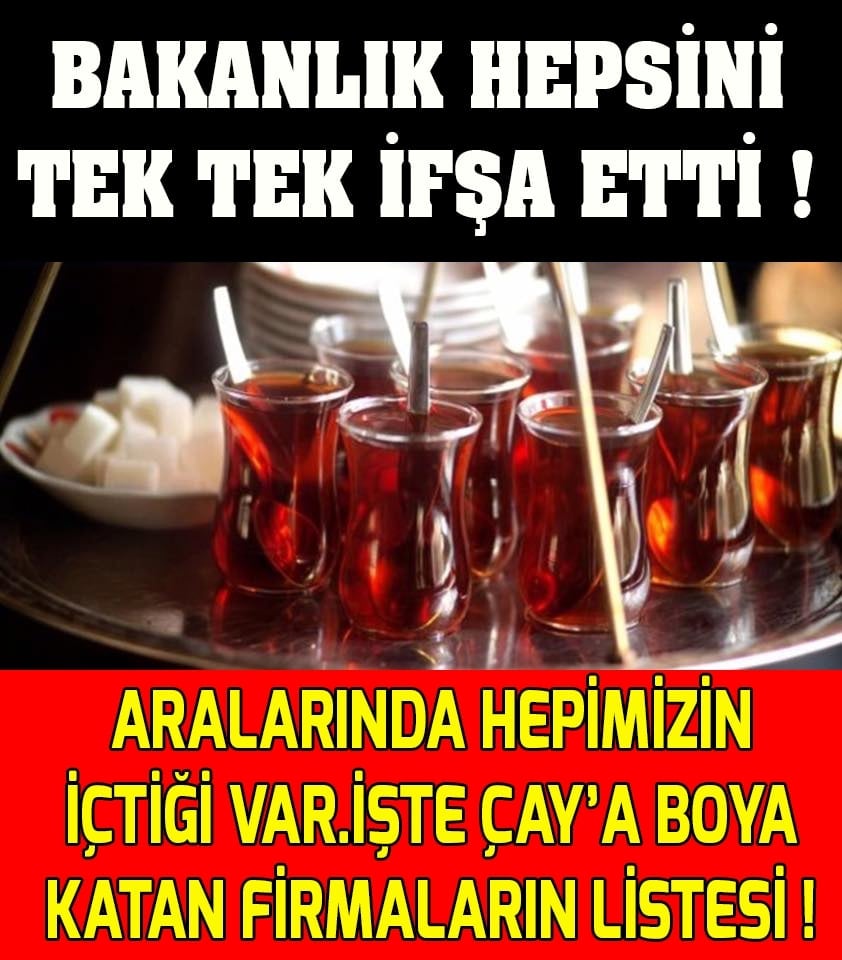 Çaya boya katarak milli keyfimizi murdar eden bu firmalar isim isim bakanlık tarafından açıklandı. Aralarında sektörün önemli isimleri bulunuyor. Türk milletinin kuşkusuz en çok içtiği içecek çaydır. İşte çaya boya katan firmaların listesi Tarım ve Orman Bakanlığı, çaya boya katarak milletin sağlığıyla oynayan firmaların listesini açıkladı. Listede sektörün önemli isimleri de bulunuyor. Çaya boya katarak milli keyfimizi murdar eden bu firmalar isim isim bakanlık tarafından açıklandı. Aralarında sektörün önemli isimleri bulunuyor. Türk milletinin kuşkusuz en çok içtiği içecek çaydır.