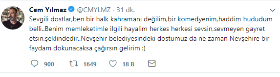 Cem Yılmaz, "Ben bir halk kahramanı değilim" diyerek, "Benim memleketimle ilgili hayalim herkes herkesi sevsin, sevmeyen gayret etsin, şeklindedir" ifadesini kullandı.