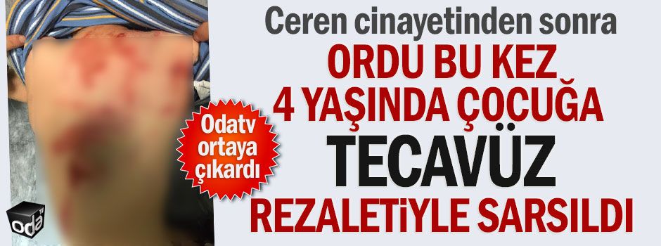 Geçen hafta Ordu’da evinin önünde bıçaklanarak öldürülen Ceren Özdemir (20) cinayeti Türkiye’nin gündeminde yer almaya devam ederken, Ordu bu kez de çocuk tecavüzü olayı ile sarsıldı. Ordu’nun Çatalpınar ilçesine bağlı Ortaköy Mahallesi’nde dün 64 yaşındaki evli ve bir çocuk babası Mehmet T. isimli zanlı, 4 yaşındaki Ö.A.D.’ye tecavüz etti ve darp etti.