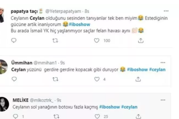 'Küçük Ceylan' olarak Türkiye'ye adını duyuran Ceylan, 20 Mart cumartesi akşamı Star TV'de ekrana getirilen İbrahim Tatlıses'in 9 yıl aradan sonra yeniden devam ettiği İbo Show'a konuk oldu. Geçirdiği estetik operasyonlar adından söz ettiren Ceylan'ın değişimini görenler gözlerine inanamadı. Ceylan'ın son hali sosyal medyada gündem oldu. Star TV'de ekrana getirilen sunuculuğunu İbrahim Tatlıses'in üstlendiği İbo Show 20 Mart cumartesi akşamı yayınlanan bölümü ile izleyenleri yine ekran başına kilitlemeyi başardı. İbo Show'a geçtiğimiz günlerde İsmail YK, Fatih Ürek, Ceylan ve Zahide Yetiş konuk oldu. Konuklar arasında sosyal medyada en çok konuşulan isimlerden biri de 'Küçük Ceylan' olarak tanınan ve popüler hale gelen Ceylan oldu. Birçok estetik operasyon için ameliyat masasına yatan ünlü şarkıcı Ceylan'ın son halini görenler gözlerine inanamadı.