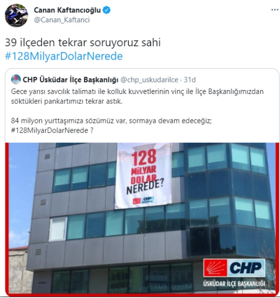 Kaftancıoğlu, sosyal medya hesabından yaptığı açıklamada, Üsküdar İlçe Başkanlığı'na asılmış pankartı paylaşarak, " 39 ilçeden tekrar soruyoruz sahi 128 Milyar Dolar Nerede" diye sordu.