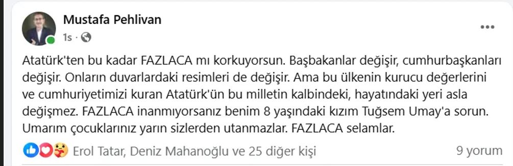 “Atatürk’ten bu kadar ‘Fazlaca’ mı korkuyorsun? Başbakanlar değişir, cumhurbaşkanları değişir. Onların duvarlardaki resimleri de değişir. Ama bu ülkenin kurucu değerleri ve Cumhuriyetimizi kuran Atatürk’ün bu milletin kalbindeki, hayatındaki yeri asla değişmez. Umarım çocuklarınız yarın sizlerden utanmazlar. Fazlaca selamlar.”