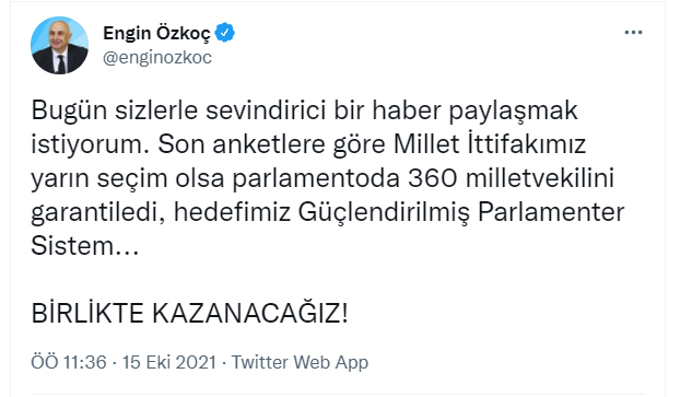 Özkoç Twitter'dan yaptığı açıklamada, "Bugün sizlerle sevindirici bir haber paylaşmak istiyorum. Son anketlere göre Millet İttifakımız yarın seçim olsa parlamentoda 360 milletvekilini garantiledi, hedefimiz Güçlendirilmiş Parlamenter Sistem...