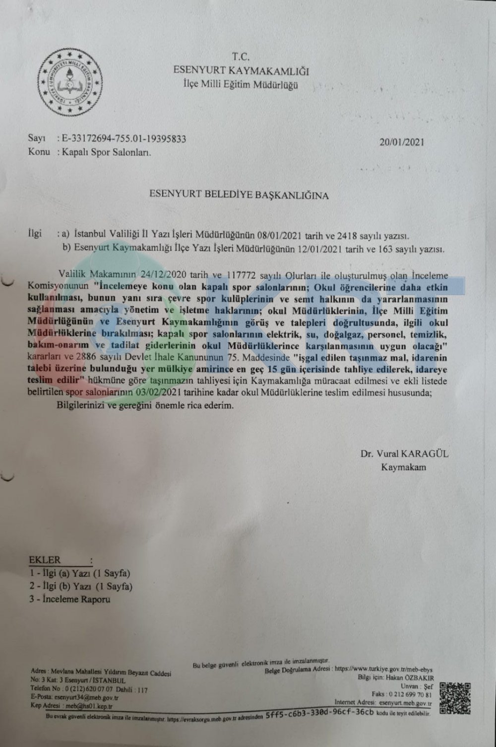 İstanbul Esenyurt'ta belediyenin bütçesinden yapılan spor salonları kaymakamlığın yazısı ile belediyeden alındı. Esenyurt Kaymalamlığı ilgili yazıyı Kaymakam Vural Karagül imzası ile 20 Ocak 2021'de Esenyurt Belediyesi'ne iletti.