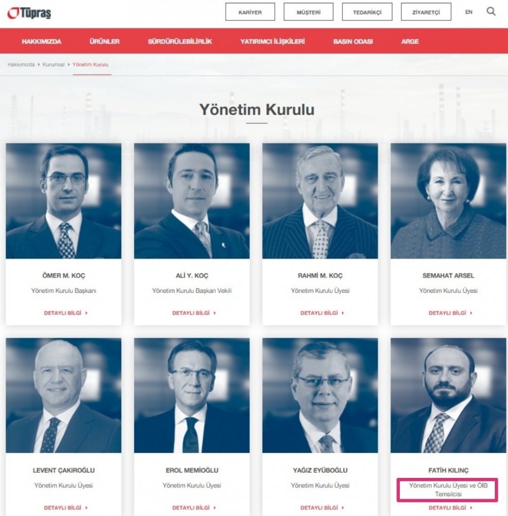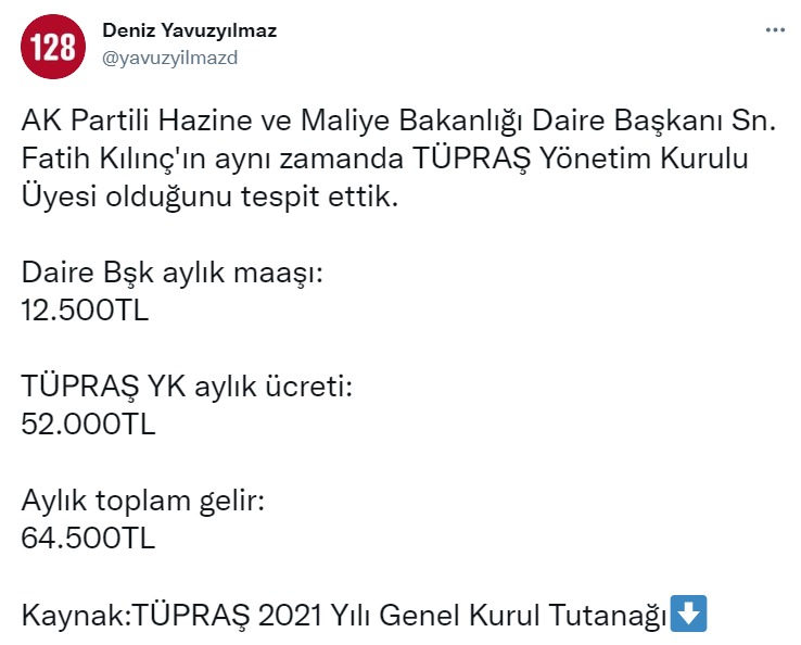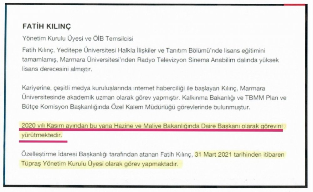 "AK Partili Hazine ve Maliye Bakanlığı Daire Başkanı Sn. Fatih Kılınç'ın aynı zamanda TÜPRAŞ Yönetim Kurulu Üyesi olduğunu tespit ettik.