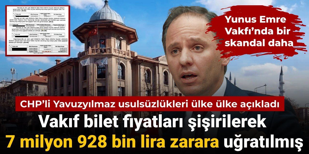CHP Genel Başkan Yardımcısı Deniz Yavuzyılmaz, kamuoyunda defalarca yolsuzluk soruşturmaları ve iddialarıyla gündeme gelen Yunus Emre Vakfı’nda (YEE) yeni usulsüzlükler tespit ettiklerini duyurdu. Yavuzyılmaz, vakfın bir organizasyon şirketi üzerinden yaptığı yurt dışı uçak bileti alımlarında bilet fiyatlarının şişirildiği, olması gerekenden daha yüksek fiyat ödenerek vakfın zarara uğratıldığını belirtti.