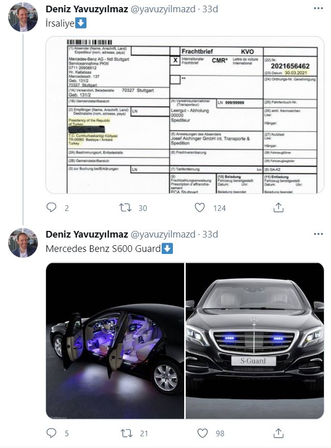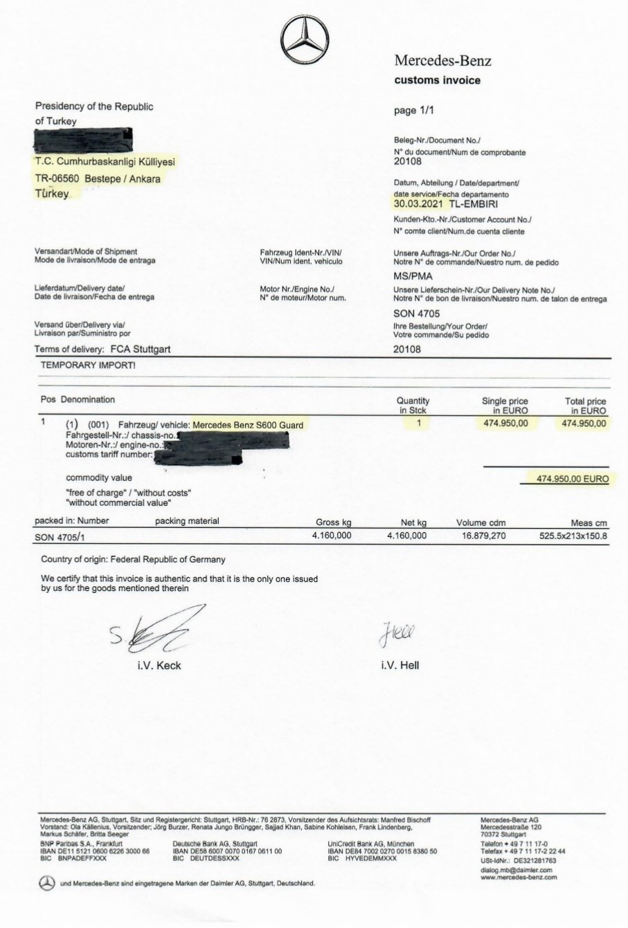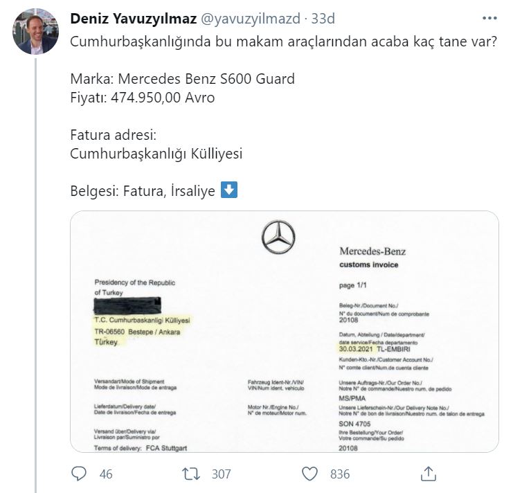 Yavuzyılmaz yaptığı paylaşımda rakamları ve fatura belgesini paylaşarak, "Marka: Mercedes Benz S600 Guard,