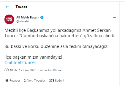 CHP Mersin Mezitli İlçe Başkanı Ahmet Serkan Tuncer gözaltına alındı. CHP Mersin Milletvekili Ali Mahir Başarır sosyal medya hesabından yaptığı açıklamada Tuncer'in “Cumhurbaşkanı’na hakaretten” gözaltına alındığını duyurdu.
