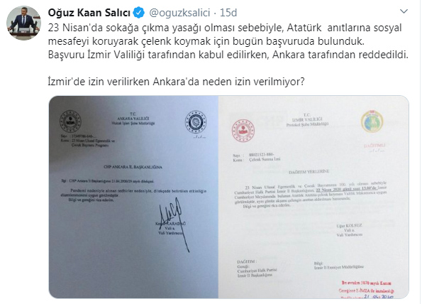 Salıcı, "23 Nisan'da sokağa çıkma yasağı olması sebebiyle, Atatürk anıtlarına sosyal mesafeyi koruyarak çelenk koymak için bugün başvuruda bulunduk.