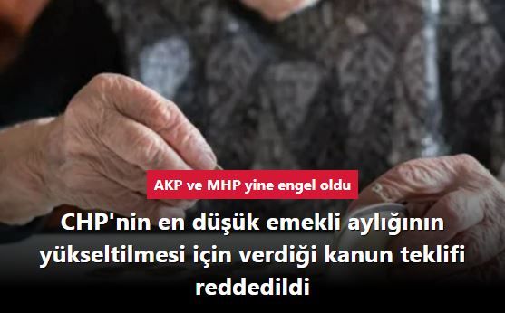 CHP emeklilerin yaşam koşullarının giderek kötüleşmesi nedeniyle Türkiye Büyük Millet Meclisi'ne (TBMM) kanun teklifi sundu. Kanun teklifinde en düşük emekli aylığının 8 bin 500 TL olması talep edildi. Teklif iktidarda yer alan AKP ve MHP oylarıyla reddedildi.