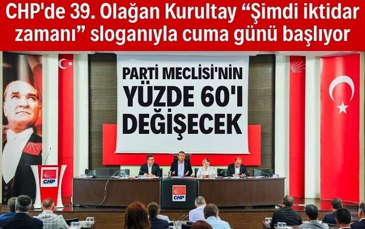 CHP’de 28-29-30 Kasım tarihlerinde Ankara’da düzenlenecek 39’uncu Olağan Kurultay hazırlıkları sürüyor. “Şimdi iktidar zamanı” sloganıyla yapılacak kurultayda CHP lideri Özgür Özel’in Parti Meclisi’ni (PM) yüzde 60 oranında değiştirmesi bekleniyor.