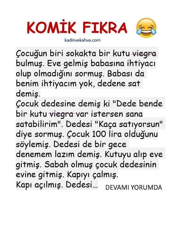 Çocuğun biri sokakta bir kutu vieg..a bulmuş. Eve gelmiş babasına ihtiyacıolup olmadığını sormuş. Babası da benim ihtiyacım yok, dedene sat demiş.Çocuk dedesine demiş ki "Dede bende bir kutu vieg..a var istersen sanasatabilirim". Dedesi "Kaça satıyorsun" diye sormuş. Çocuk 100 lira olduğunusöylemiş. Dedesi de bir gece denemem lazım demiş. Kutuyu alıp eve gitmiş. Sabah olmuş çocuk dedesinin evine gitmiş. Kapıyı çalmış. Kapı açılmış. Dedesi...DEVAMI DİĞER SAYFADA.