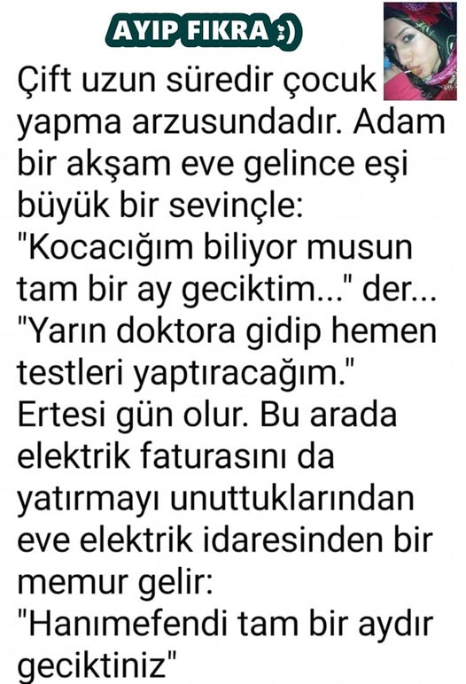 Çift uzun süredir çocuk yapma arzusundadır. Adam bir akşam eve gelince eşi büyük bir sevinçle: