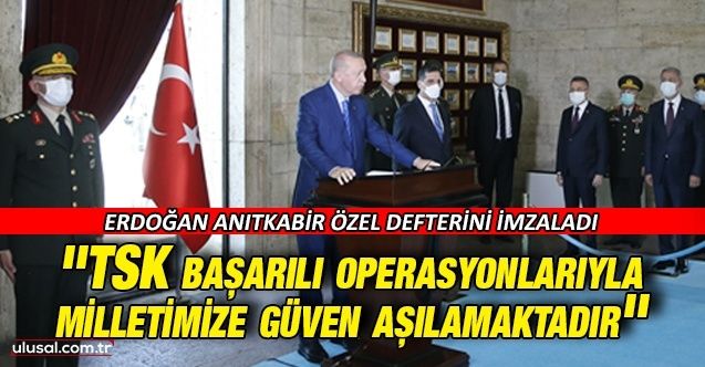 Erdoğan başkanlığındaki heyet, mozoleye çıkan merdivenin önünde fotoğraf çektirdikten sonra Misakı Milli Kulesi'ne geçti. Burada Anıtkabir Özel Defteri'ni imzalayan Cumhurbaşkanı Erdoğan, deftere şunları yazdı: