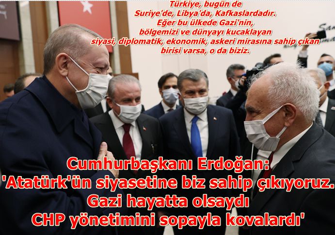 Biz ABD'de BM binasının tam karşısında Türkevi inşa ettik. Ve orada adeta birilerine mesajımızı da en güzel şekilde verdik. Gazi Mustafa Kemal'in bu serencamı bugünkü Türkiye'nin yol haritasıdır. Türkiye, bugün de Suriye'de, Libya'da, Kafkaslardadır. Eğer bu ülkede Gazi'nin, bölgemizi ve dünyayı kucaklayan siyasi, diplomatik, ekonomik, askeri mirasına sahip çıkan birisi varsa, o da biziz.