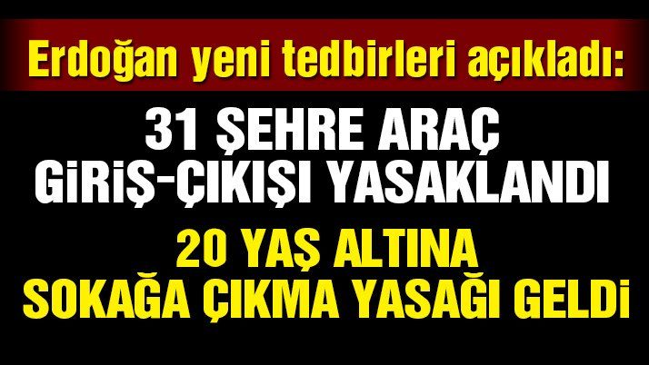 *65 yaş üstü sıkınta da 20 yaş altı sıkında değil gibi bir garantimiz yok. Temel ihtiyaç malzemeleri temin edilebilir. Dışarı çıkmak zorunda olan vatandaşlarımız için de yeni bir uygulama başlatıyoruz. Pazar yerleri ve marketler gibi, insanların toplu bulunduğu alanlarda herkesin maske takması zorunlu olacaktır.