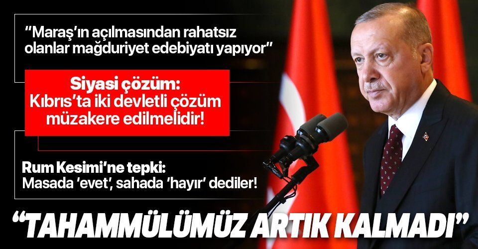 Akdeniz'in ecdadımızın döneminde olduğu gibi yeniden bir huzur havzası haline gelmesi gerektiğini savunduk ancak bunun karşılığını alamadık. Avrupa ülkeleri Yunanistan'ın ve Kıbrıs Rum Kesimi'nin şımarıklıklarına göz yumdu. Doğu Akdeniz'de haklarımızı korumakta kararlıyız. Biz RumYunan ikilisinin haklarımızı gasp etmesine engel olmaya çalışıyoruz. Diplomasi ve müzakere bizleri ortak paydaya ulaştıracak en kısa yoldur. Doğu Akdeniz konferansı önerimiz bu irademizin samimi ifadesidir. Arzumuz AB'nin uzattığımız eli havada bırakmaması. Karadeniz'de keşfettiğimiz 405 milyar metreküplük doğalgaz rezervi enerjiyi işbirliğine dönüştürme irademizi daha da kuvvetlendirmiştir. İnşallah Doğu Akdeniz'deki araştırma faaliyetlerimizden de müjdeli haber alacağımıza inanıyoruz. Sondaj faaliyetlerimize adil bir anlaşma sağlanana kadar devam edeceğiz.