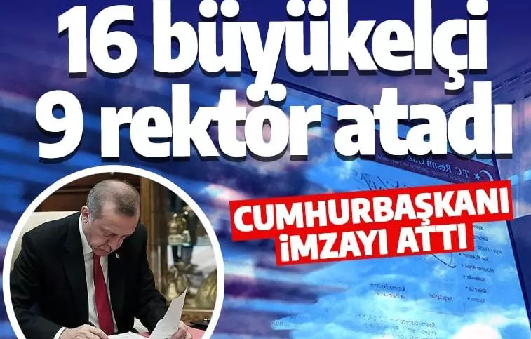 Cumhurbaşkanı Recep Tayyip Erdoğan'ın imzasıyla bazı bakanlık, kurum ile kuruluşlara ilişkin atama ve görevden alma kararları, Resmi Gazete'nin bugünkü sayısında yayımlandı. Ayrıca Cumhurbaşkanı Erdoğan'ın imzasıyla büyükelçi ve rektör atama kararları da Resmi Gazete'de yayımlandı.