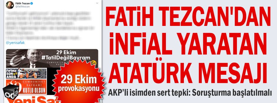 Yeni Şafak’ın sür manşetinde Atatürk’lü 29 Ekim reklamının bulunmasına tepki gösteren Tezcan, Twitter hesabından yaptığı paylaşımda şu ifadeleri kullandı: