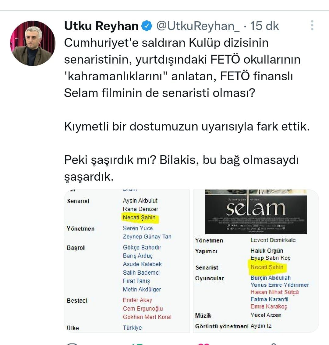Cumhuriyet'e saldıran Kulüp dizisinin senaristinin, yurtdışındaki FETÖ okullarının 'kahramanlıklarını" anlatan, FETÖ finanslı Selam filminin de senaristi olması? Kıymetli bir dostumuzun uyarısıyla fark ettik. Peki şaşırdık mı? Bilakis, bu bağ olmasaydı şaşardık.