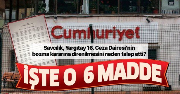 Söz konusu yazıda; "Yargıtay 16. Ceza Dairesi'nin 12 Eylül 2019 tarihli bozma kararına CMK'nun 307/3 maddesi göre Direnme Kararı verilerek, daha önceki 16 Mart 2018 tarihli mütaalamızda belirtilen sevk maddeleri gereğince sanıkların cezalandırılmasına karar verilmesi kamu adına talep ve mütalaa olunur" denildi.