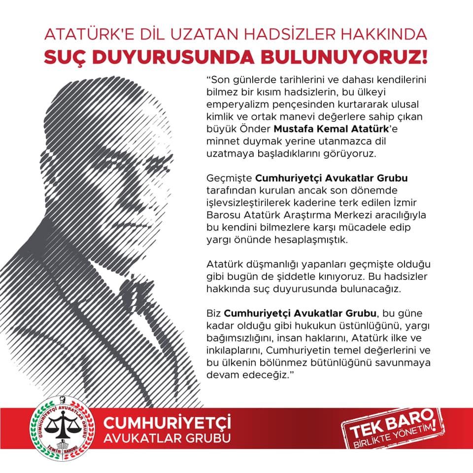 Cumhuriyet'imize, ülke bütünlüğüne duyarlılığıyla bilinen İzmir Barosu Cumhuriyetçi Avukatlar grubu Atatürk'e hakaretlere karşı harekete geçti.