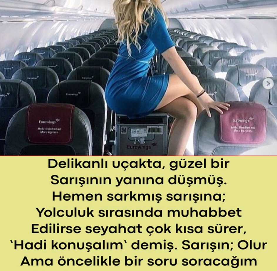 Delikanlı uçakta, güzel bir sarışının yanına düşmüş. Hemen sarkmış sarışına; Yolculuk sırasında muhabbet edilirse seyahat çok kısa sürer, ‘hadi konuşalım’ demiş. Sarışın okuduğu kitabı yavaşça kapatarak ‘ne üzerine konuşmak istersin’ demiş. Delikanlı: Devamını okumak için diğer sayfaya görseli tklayarak geçebilirsiniz