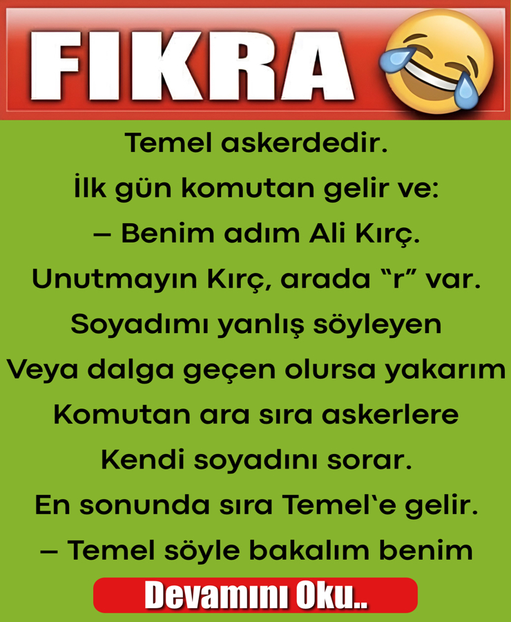Temel askerdedir. İlk gün komutan gelir ve: – Benim adım Ali Kırç. Unutmayın Kırç, arada “r” var. Soyadımı yanlış söyleyen veya dalga geçen olursa yakarım. Komutan ara sıra askerlere kendi soyadını sorar. En sonunda sıra Temel’e gelir. – Temel söyle bakalım benim adım ne?