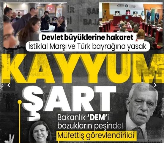İçişleri Bakanı Ali Yerlikaya, X hesabından yaptığı açıklamada, "DEM Parti yöneticilerinin, Diyarbakır Sur Belediyesi mazbata töreni sonrasında, makam odasında bulunan Cumhuriyetimizin kurucusu Gazi Mustafa Kemal Atatürk ve Cumhurbaşkanımız Sayın Recep Tayyip Erdoğan’ın fotoğraflarına yönelik hakaret içeren sözleriyle ilgili Mülkiye Müfettişi görevlendirilmiştir." dedi.