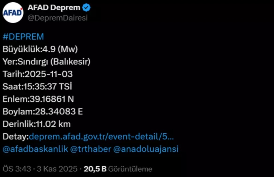 Saat 15:35'te gerçekleşen depremin merkez üssü ise yine Balıkesir'in Sındırgı ilçesi.