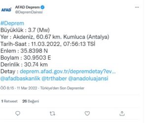 AFAD’ın internet sitesinde yer alan bilgiye göre: Antalya’nın Kumluca ilçesinde saat 07.56’da 3.7 büyüklüğünde bir deprem meydana geldi. Vatandaşların sarsıntıyı net bir şekilde hissettiği öğrenildi.