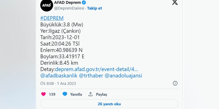 AFAD, Çankırı'nın Ilgaz ilçesinde 3.8 büyüklüğünde deprem meydana geldiğini duyurdu.