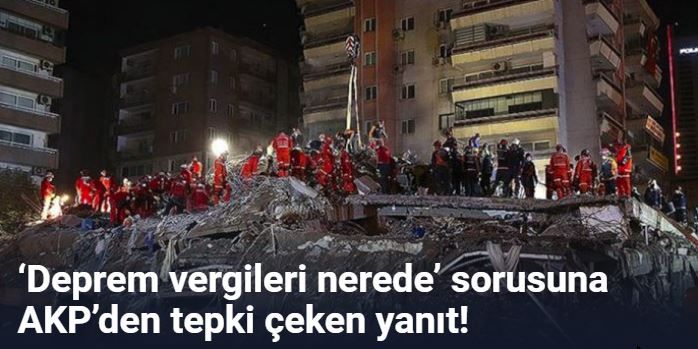 İzmir'de yaşanan deprem sonrası vatandaşlar, "deprem vergileri nerede" sorusu tekrar gündeme getirdi. AKP Grup Başkanı Naci Bostancı, " Bunlar toplanacak ve depreme gönderilecek tarzında bir düzenleme söz konusu değildir" ifadelerini kullandı.