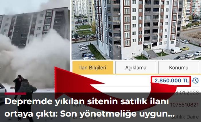 Yeşilyurt ilçesinde depremin ardından yıkılan bir siteye ilişkin çarpıcı bir detay ortaya çıktı. Bir internet sitesine 28 Ocak tarihinde verilen satılık ilanında, binadaki 4+1 olarak belirtilen bir daireye 2 milyon 850 bin lira fiyat biçildiği görüldü. İlanın açıklamasındaki "Bina, son deprem yönetmeliğine uygun olup 35/40 beton kullanılmış olup tüm malzemeler 1. sınıf kalite ve işçilik ile tamamlanmıştır" ifadeleri ise dikkat çekti.