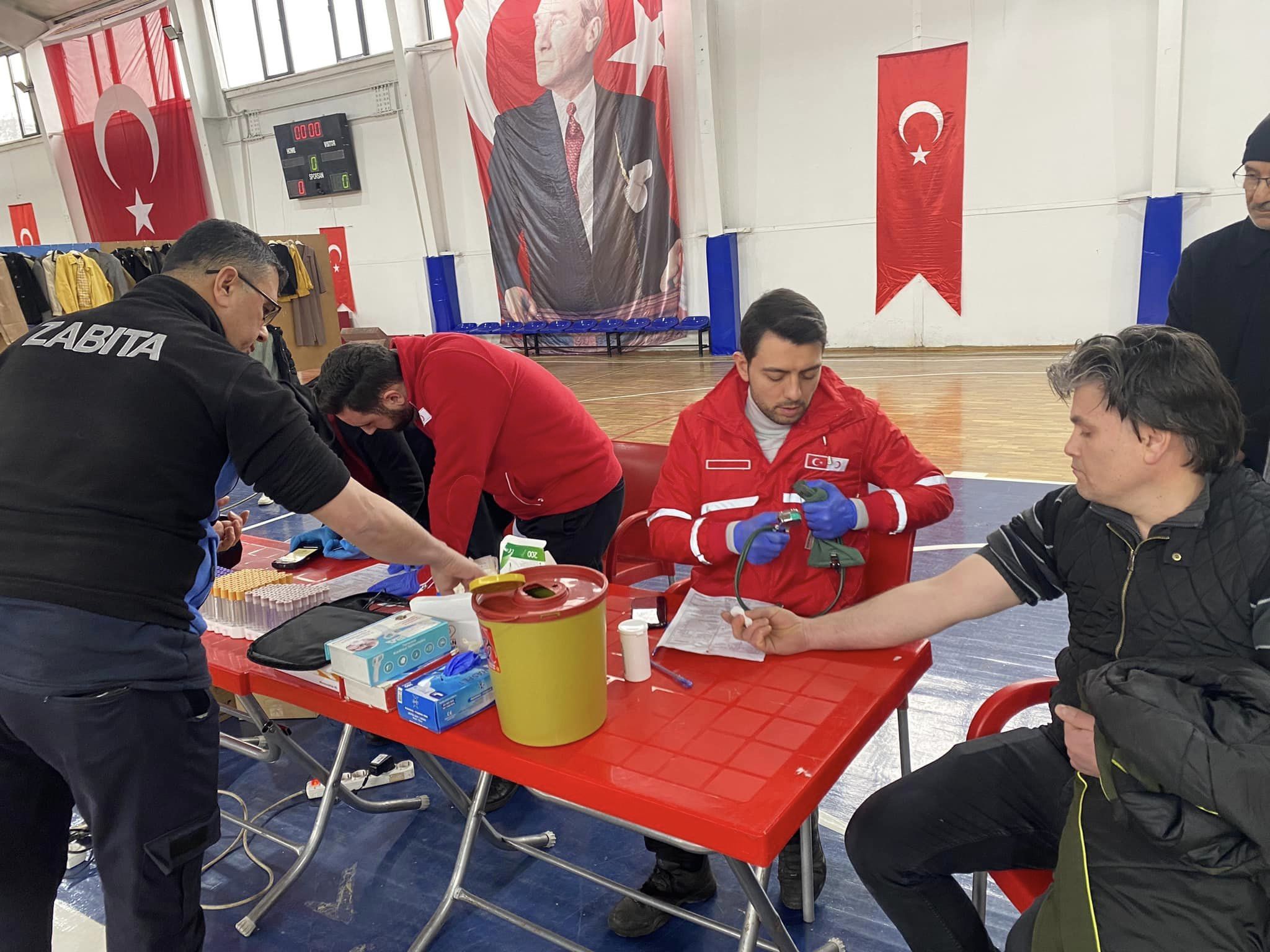 kalmayan depremzedelere destek olmak için kan bağışı Alaplılar kapalı salonuna