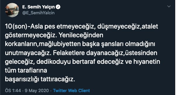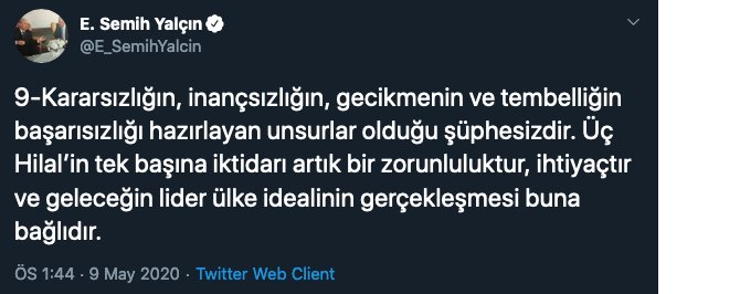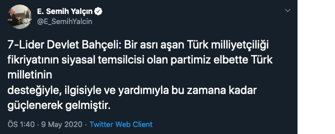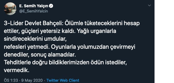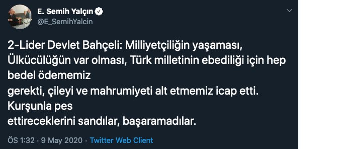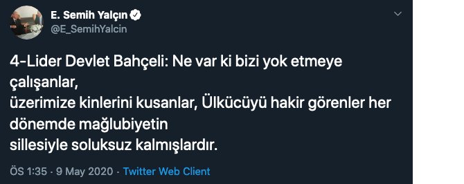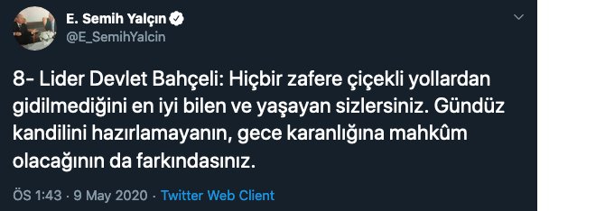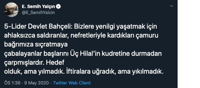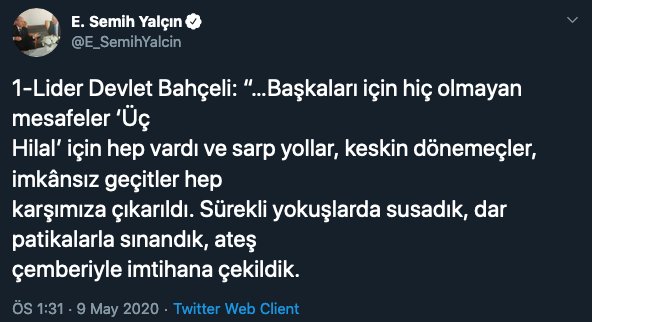 Semih Yalçın'ın Twitter adresinden paylaştığı gündem yaratacak mesajlar şöyle;1-Lider Devlet Bahçeli: “…Başkaları için hiç olmayan mesafeler ‘Üç Hilal’ için hep vardı ve sarp yollar, keskin dönemeçler, imkânsız geçitler hep karşımıza çıkarıldı. Sürekli yokuşlarda susadık, dar patikalarla sınandık, ateş çemberiyle imtihana çekildik.