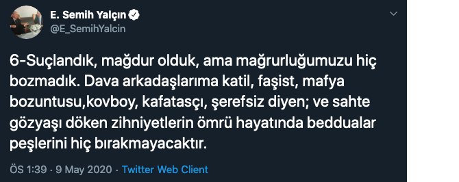 6-Suçlandık, mağdur olduk, ama mağrurluğumuzu hiç bozmadık. Dava arkadaşlarıma katil, faşist, mafya bozuntusu,kovboy, kafatasçı, şerefsiz diyen; ve sahte gözyaşı döken zihniyetlerin ömrü hayatında beddualar peşlerini hiç bırakmayacaktır.