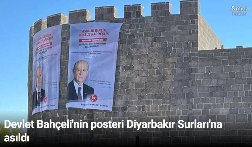 Amida Haber'den Kasım Sarsılmaz'ın haberine göre, MHP Diyarbakır İl Teşkilatı Dağkapı Meydanı’ndaki Dağkapı burcuna Devlet Bahçeli’nin dev posterini astı. MHP Diyarbakır İl Teşkilatı geçtiğimiz aylarda da, Sur, köprü ve üst geçitlere MHP bayrağı asmıştı.