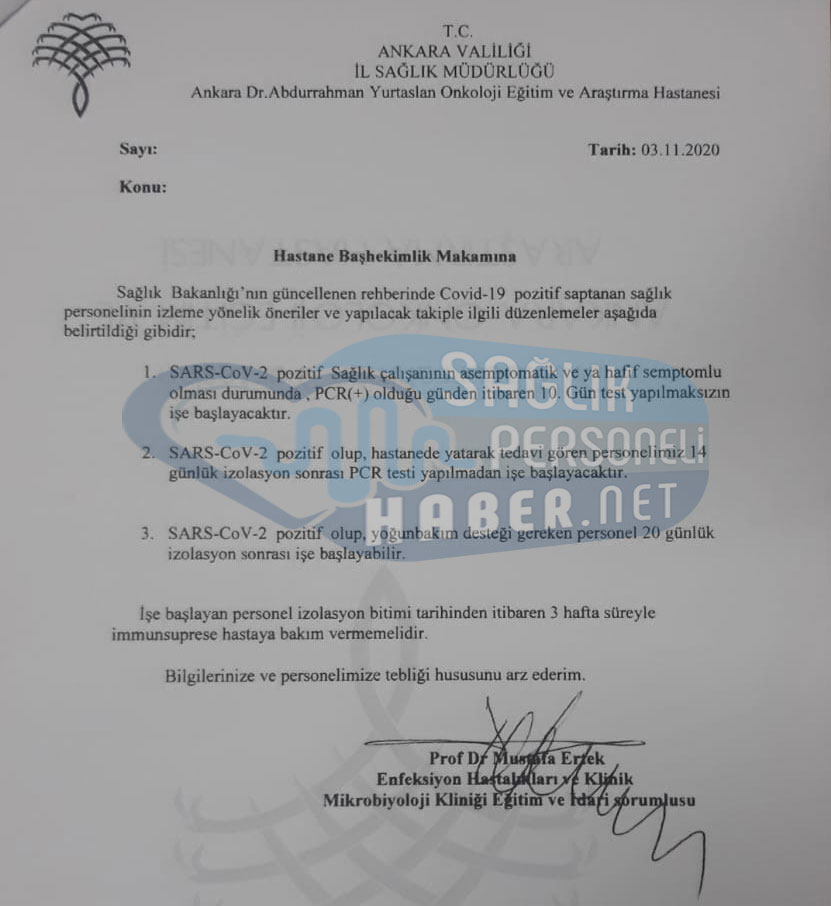 Dr. Abdurrahman Yurtaslan Onkoloji Eğitim ve Araştırma Hastanesi Enfeksiyon Komitesi tarafından Başhekimliğe yazıldığı iddia edilen yazıda; Sağlık Bakanlığının yayınladığı rehber dayanak gösterilerek pozitif sağlık çalışanlarının test yapılmaksızın 10. gün sonunda işe başlamaları istendi.