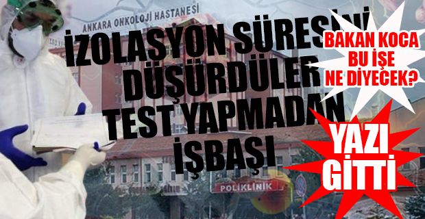 Ankara'da Dr. Abdurrahman Yurtaslan Onkoloji Eğitim ve Araştırma Hastanesi koronavirüse yakalanan sağlık çalışanlarının evde izolasyon süresini düşürdü. Düşürmekle kalmadı izolasyon süresinin 10. gününün sonunda test yapılmaksızın iş başı yapılacak yazısıyla resmiyet kazandı.