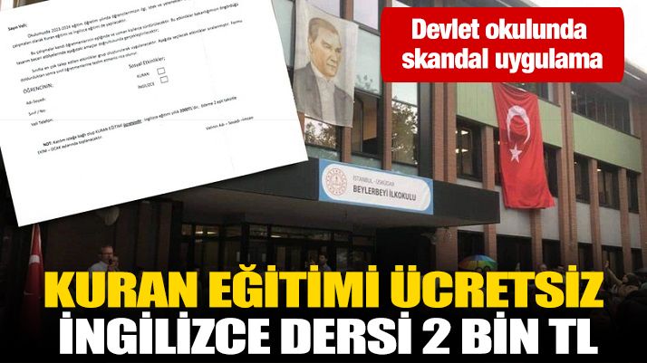 İstanbul’da bulunan Beylerbeyi İlkokulu’nda çocuklar için Kuran ve İngilizce eğitimi yapılacağı duyuruldu. Kuran eğitiminin ücretsiz olarak verileceği belirtilirken İngilizce eğitiminden 2 bin TL istenmesi tepki çekti.