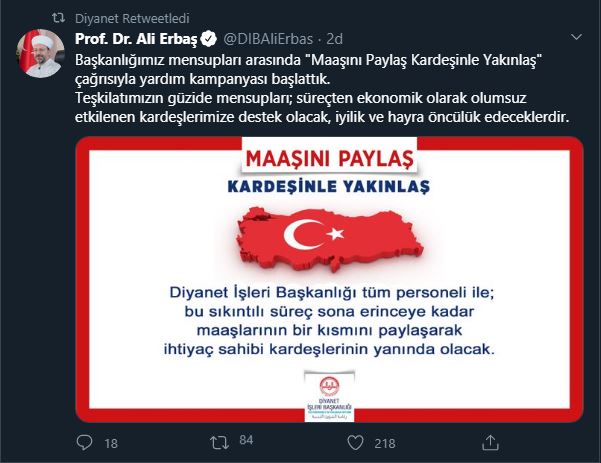 Kampanyayı Twitter adresinden duyuran Erbaş, "Başkanlığımız mensupları arasında "Maaşını Paylaş Kardeşinle Yakınlaş" çağrısıyla yardım kampanyası başlattık. Teşkilatımızın güzide mensupları; süreçten ekonomik olarak olumsuz etkilenen kardeşlerimize destek olacak, iyilik ve hayra öncülük edeceklerdir." ifadelerini kullandı.