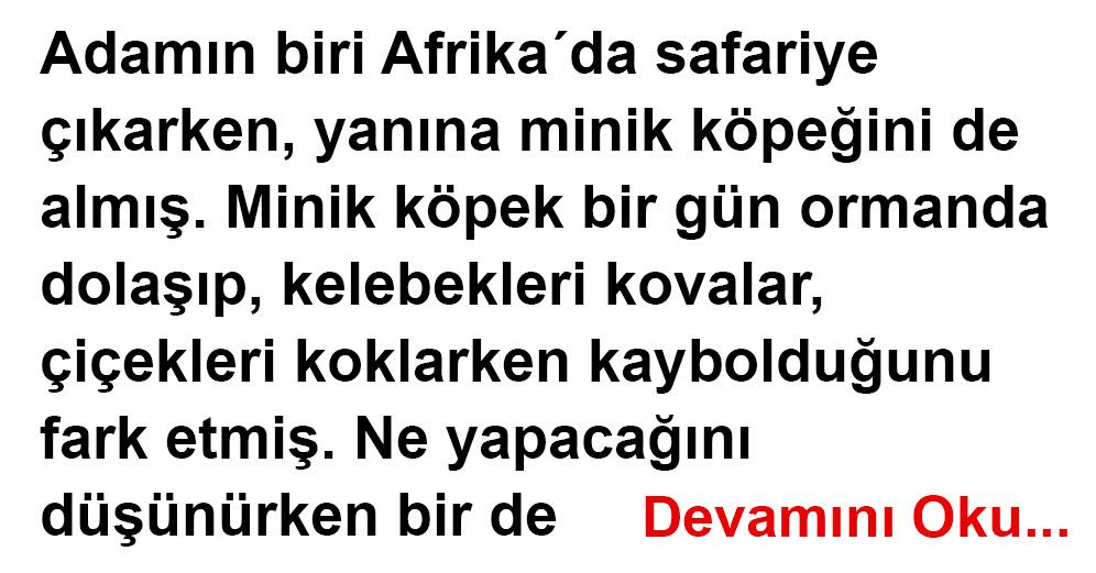 Minik köpek bir gün ormanda dolaşıp, kelebekleri kovalar, çiçekleri koklarken kaybolduğunu fark etmiş. Ne yapacağını düşünürken bir de bakmış ki karşıdan bir leopar geliyor ve belli ki günlük yiyeceğini arıyor.
