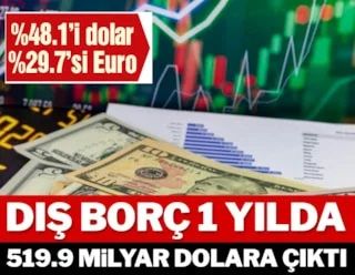 TCMB verilerine göre Türkiye’nin brüt dış borcunun 167.4 milyar doları kısa vadeli, 352.6 milyar doları uzun vadeli borçlardan oluşuyor. Son dönemde hem iç hem de dış borçlanmaları hızlandıran Türkiye’nin 5 yıllık dönemde brüt dış borcu 142 milyar dolar birden arttı. Net dış borç yükümlülükleri ise 13.2 milyar dolar artışla 181.8 milyar doları aştı.