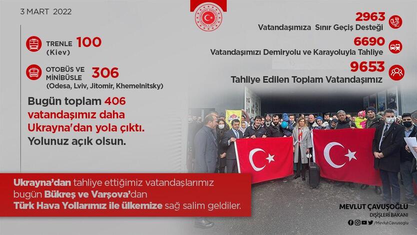 Bugün Ukrayna'dan 406 kardeşimiz daha yola çıktı. Tahliye ettiğimiz vatandaşlarımızın sayısı 9 bin 653 oldu. Ayrıca Ukrayna'dan tahliye ettiğimiz vatandaşlarımız bugün Bükreş ve Varşova'dan Türk Hava Yollarımızla ülkemize sağ salim geldiler. Hoş geldiniz.