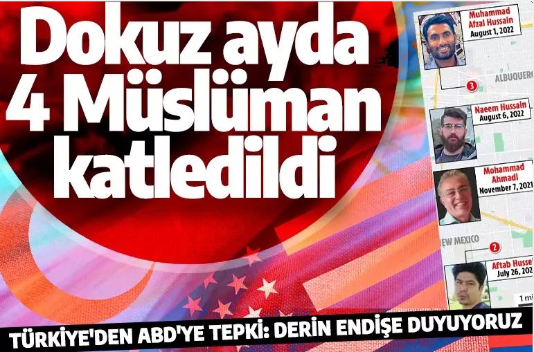 "ABD'nin Albuquerque şehrinde, 3'ü son bir hafta içinde olmak üzere, kasım ayından bu yana 4 Müslüman şahsın şüphe uyandıracak şekilde art arda öldürülmelerinden derin endişe duyuyoruz. Polis tarafından birbiriyle bağlantılı olabileceği ifade edilen ve nefret suçu olması ihtimali bulunan bu seri cinayetlerin faillerinin derhal bulunarak adalet önüne çıkartılmalarını istiyor, ilgili ABD makamlarının olayın tüm boyutlarıyla bir an evvel aydınlığa kavuşturulması için gerekli her türlü soruşturma ve araştırmayı titizlikle yapmasını bekliyoruz. Hayatını kaybedenlere Allah'tan rahmet, ailelerine ve yakınlarına başsağlığı diliyoruz.''