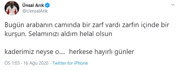 Twitter hesabından yazan şampiyon boksör "Bugün arabanın camında bir zarf vardı zarfın içinde bir kurşun. Selamınızı aldım helal olsun" ifadelerini kullandı.