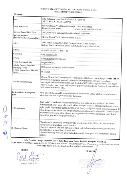 Diyanet İşleri Başkanlığı’nın personelinin indirimli tatil yapması için anlaştığı otel tanıdık çıktı. Sözleşme imzalanan Altis Resort Otel & SPA, eski TBMM Başkanı İsmail Kahraman’ın akrabası Talip Kahraman Şirketler Grubu’na ait.