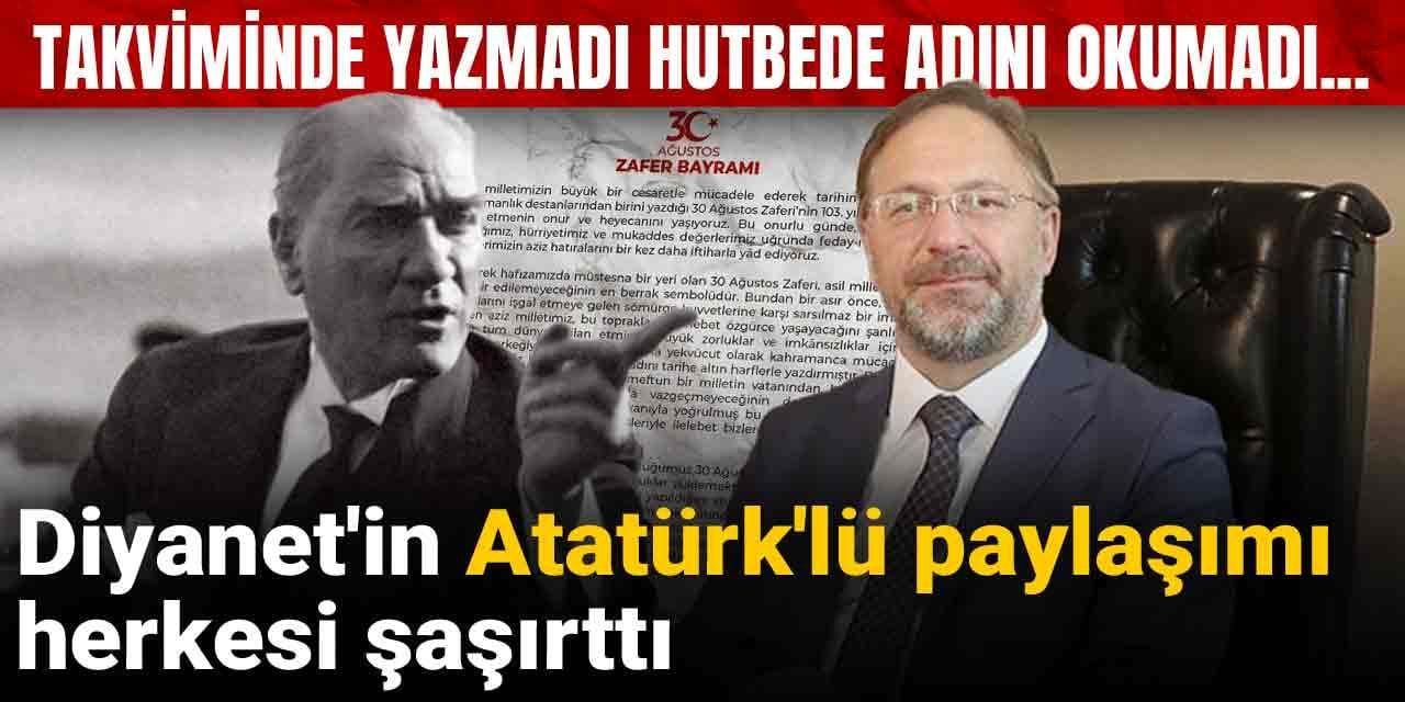 Atatürk'ün adının geçmediği hutbe nedeniyle eleştirilerin hedefi olan Diyanet'in 30 Ağustos Zaferi’nin 103’üncü yıl dönümü nedeniyle yayımladığı mesajda, bu kez Atatürk'ün adına yer verildi. “Müşterek hafızamızda müstesna bir yeri olan 30 Ağustos Zaferi, asil milletimizin asla esir edilemeyeceğinin en berrak sembolüdür” sözlerinin yer aldığı açıklamada,